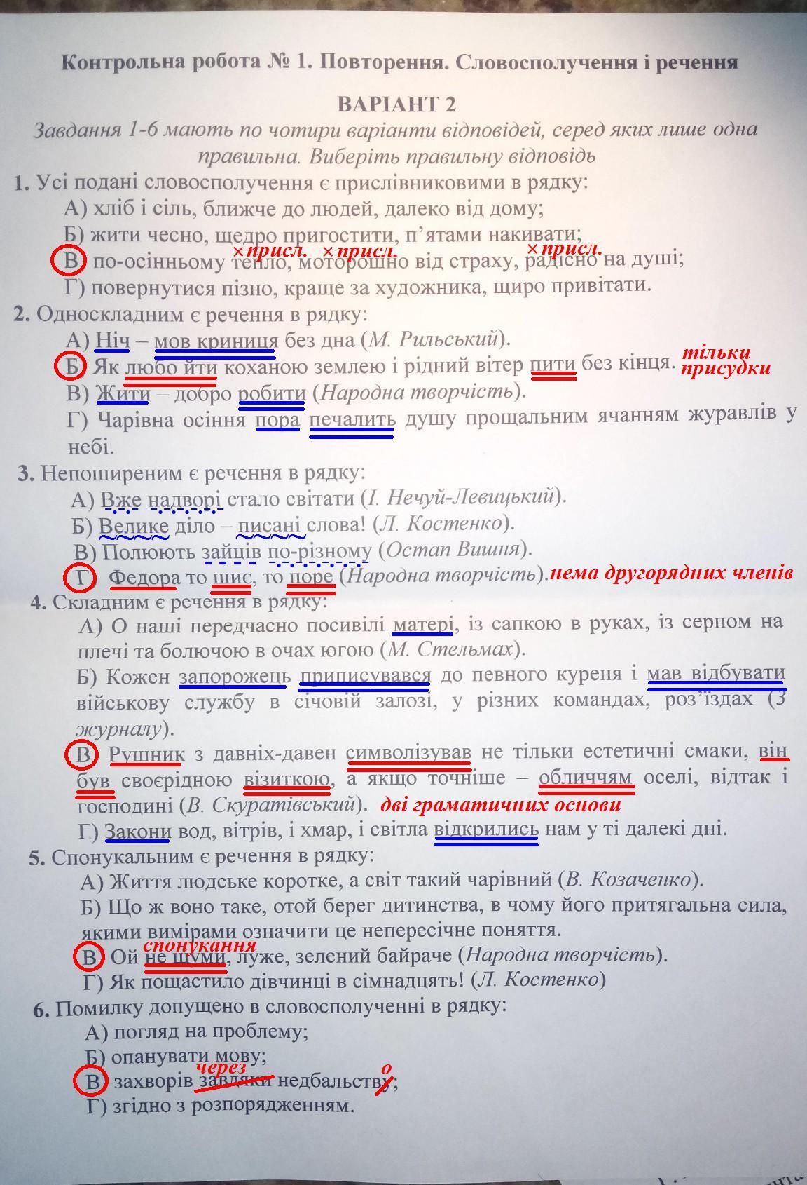 Контрольна робота з української мови для учнів8 класу на тему "Словосполучення. Речення (загальні відомості)"