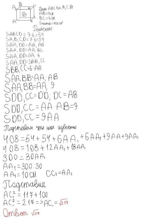 Площадь полной поверхности прямоугольного параллепипеда 408см², а стороны основания 9см и 6см. Найдите диагонали прямоугольного параллепипеда