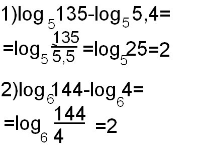 А)вычислите log(по основанию 5)135-log(по основанию 5)5,4 Б)log(по основанию 4)104-log(по основанию 4)6,5 В)log(по основанию 6)144-log(по основанию 6)4