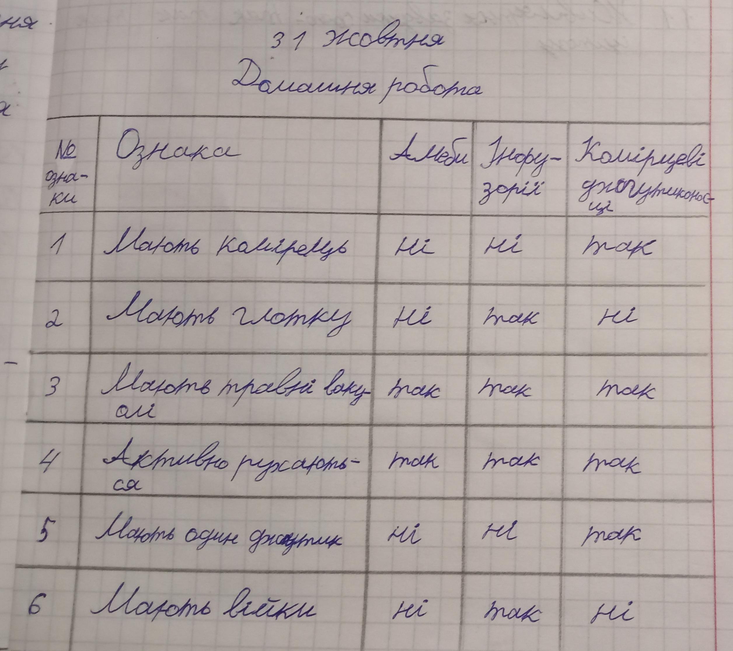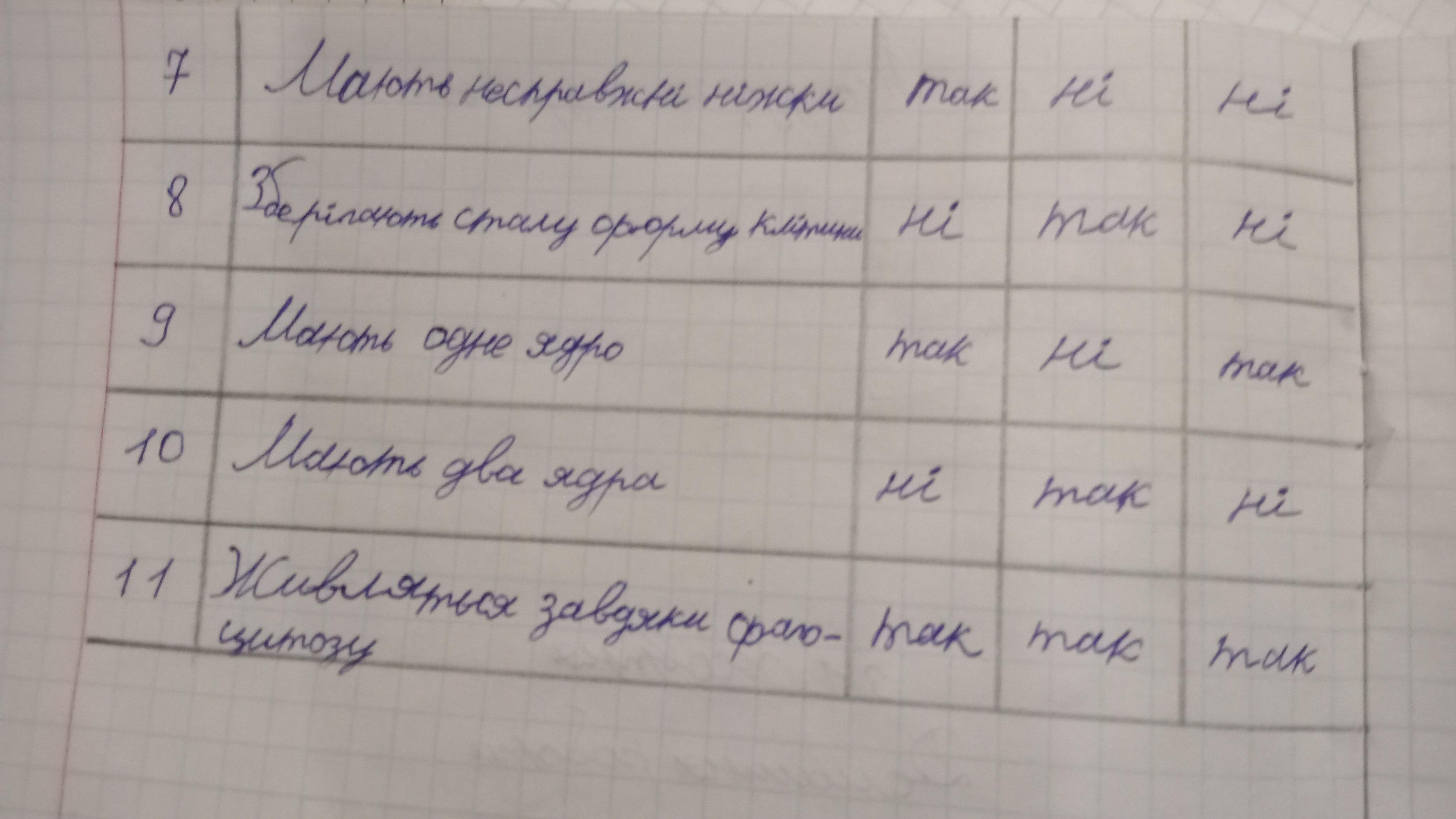 ЗАВДАННЯ Заповніть таблицю в зошиті, поставивши проти вказаної ознаки «так» або «ні» у стовпчиках, що стосуються відповідних організмів. No ознаки 1 2 3 4 5 6 Ознака Мають комірець Мають глотку Мають травні вакуолі Активно рухаються Мають один ДЖГУТИК Мають війкИ Амеби Інфузорії Hi ні Комірцеві джгутиконосцi так