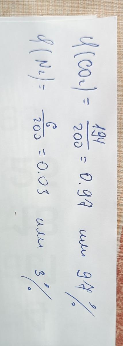 Анализ атмосферы Венеры показал, что в 200мл венерианского воздуха содержится 194 мл углекислого газа и 6 мл азота. Рассчитайте объемные доли газов в атмосфере Венеры.