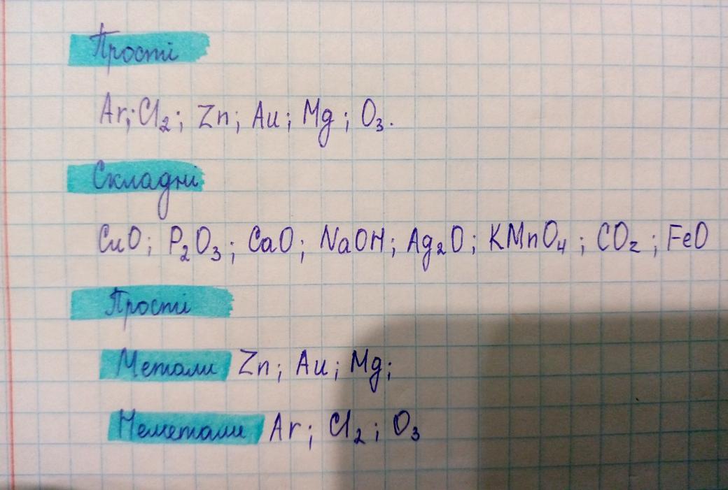 (26) Проаналізуйте хімічні формули : CuO, P2Os, Ar, Cl2, CaO, NaOH, Zn, Au, Ag2O, KMnO4, COz, Mg, О3, FeO. Класифікуйте ці речовини на прості й складні, а прості - на метали й неметали.