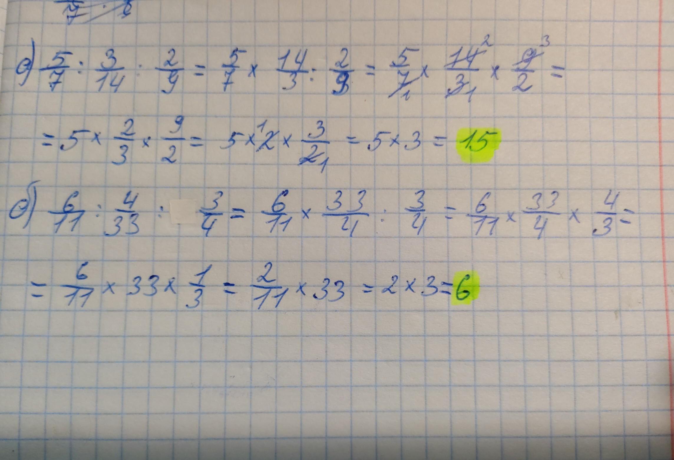6/11 : 4/33 : 3/4 = 6/11 * 33/4 * 4/3 = 2 * 3 =6