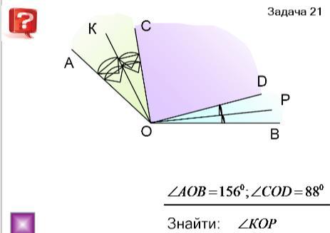 Точно незнаю але думаю 122 тому що кут KOP знаходиться по центру між кутами AOB і COD а оскільки KOP по центру нам потрібно знайти середнє число і якщо 156 відняти 34 і 88 додати 34 то вийде середнє 122