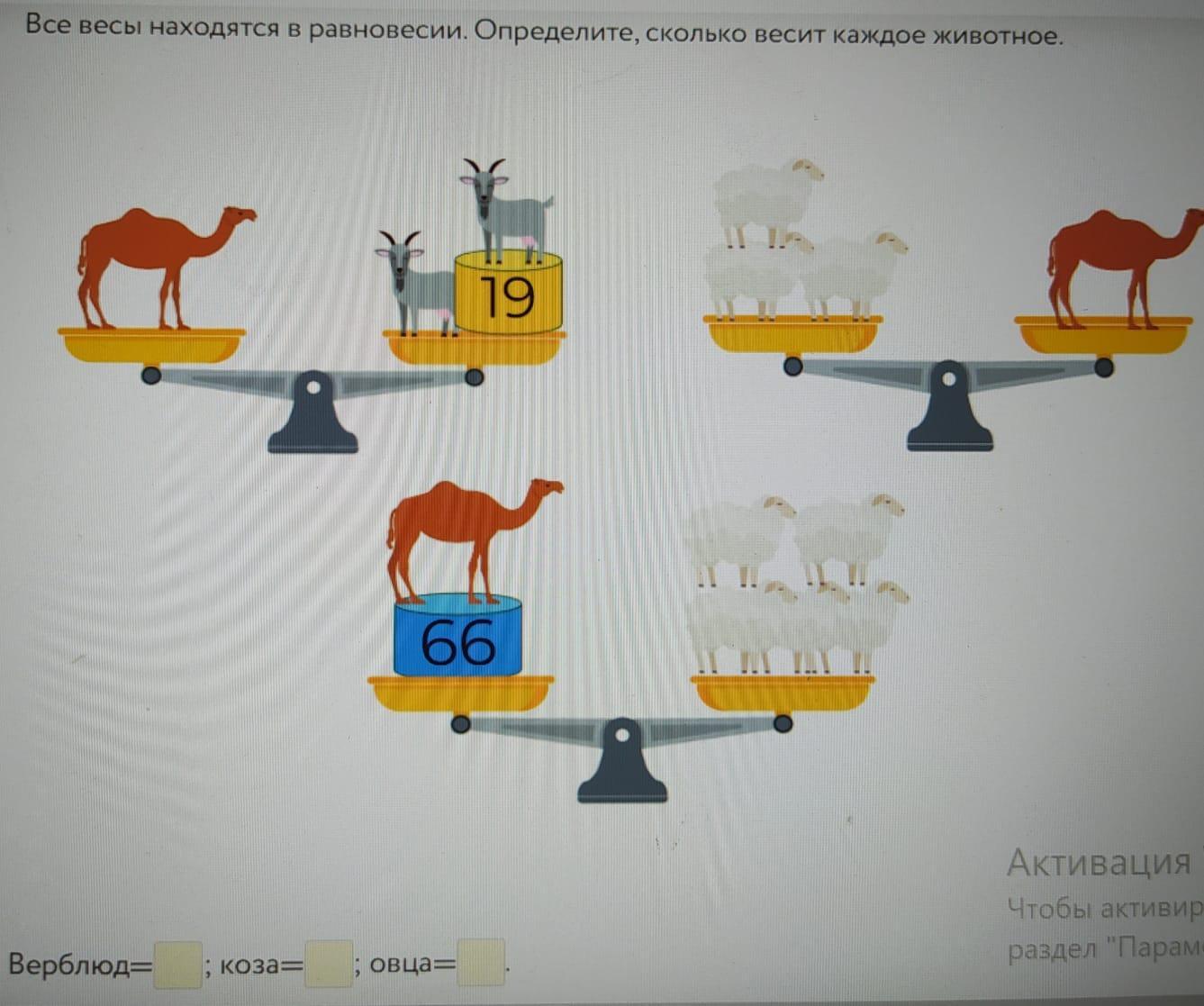 1 овечка весит 33. верблюд весит 99. козел весит 40.