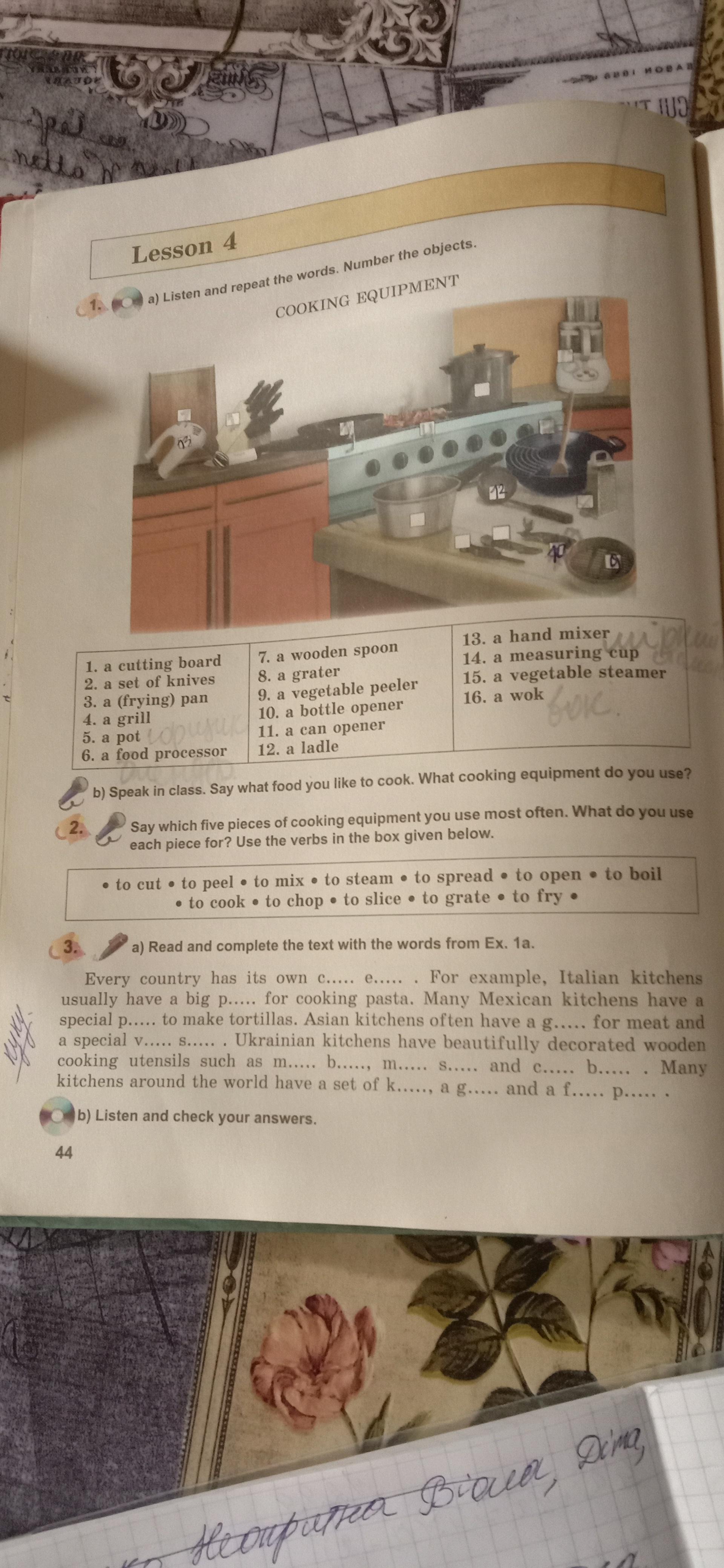 Every country has its own cooking equipment. For example, Italian kitchens usually have a big pot for cooking pasta. Many Mexican kitchens have a special pan to make tortillas. Asian kitchens often have a grill for meat and a special vegetable steamer. Ukrainian kitchens have beautifully decorated wooden cooking utensils such as measuring cups, spoons and cutting boards. Many kitchens around the world have a set of knives, a grill and a food processor.