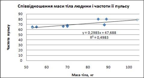 Для наочного відображення зв'язку між масою тіла людини та її пульсом побудуйте точкову діаграму. Логічно припустити, що саме маса тіла людини визначає частоту пульсу, а не навпаки. Тому маса тіла буде факторною ознакою, значення якої розміщуватимуться на осі X, а частота пульсу — результативною, і її значення вказуватимуться на осі У.