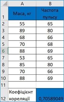 У клітинці В12 обчисліть коефіцієнт кореляції за формулою =CORREL(A2:А10;В2:В10). Він має дорівнювати 0,706. Проаналізуйте отриманий результат.