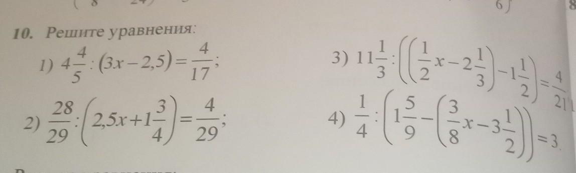 10. Решите уравнения: 4 4 1) 4 : (3x-2,5) = 17 5 2) 28 29 3 4 29 3) 11 + G*-2)-14 3 8 4) 4 П = 3 H 2119. I