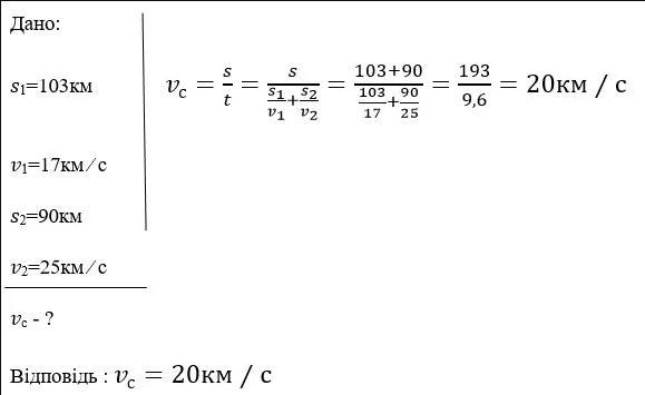 Влетівши в земну атмосферу метеорит зі швидкістю 17км ⁄ с пронісся 103км і набув швидкості 25км/с та пролетів останні 90км свого життя, поки не розплавився остаточно. Якою була середня швидкість його руху на всьому шляху?