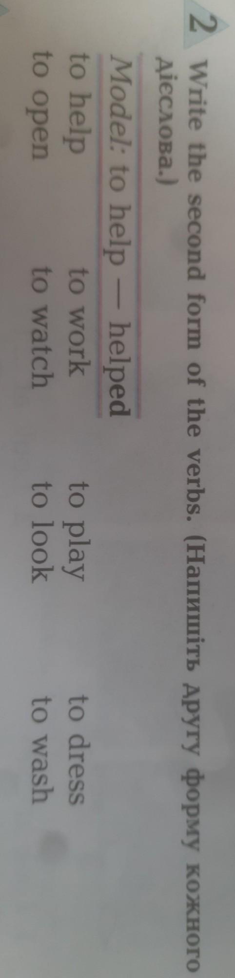 Ответ: help=helped.open=opened.work=worked.watch=watched.play=played.look=looked.dress=dressed.wash=washed
