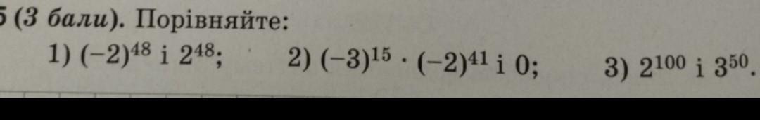 (3 бали). Порівняйте: 1) (-2)48 i 248, 2) (-3)¹5 (-2)4¹ i 0; . 3) 2100 i 350,срочно задание на фото срочноооооооооо дам 100 баллов