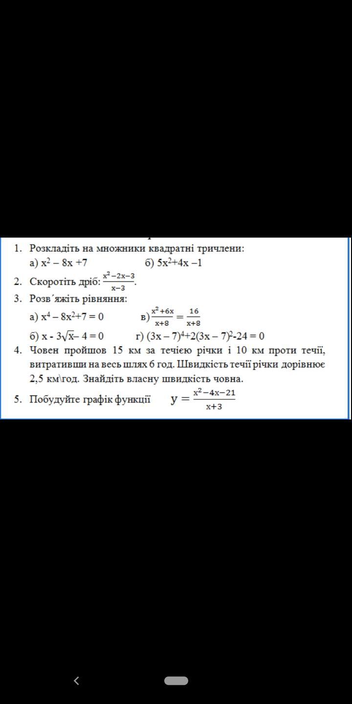 б) х-3VK-4=0 г) (3x-7)++2(3х-7)2-24=0 4. Човен пройшов 15 км за течією річки і 10 км проти течії, Витративши на весь шлях 6 год. Швидкість течії річки дорівнює 2,5 км год. Знайдіть власну швидкість човна.