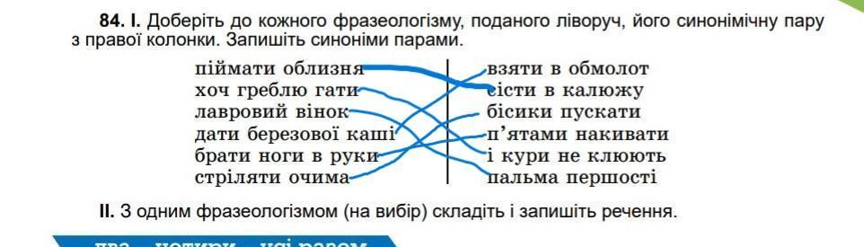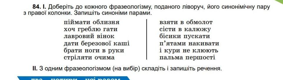 Доберіть до кожного фразеологізму, поданого ліворуч, його синонімічну пару з правої колонки. Запишіть синоніми парами.