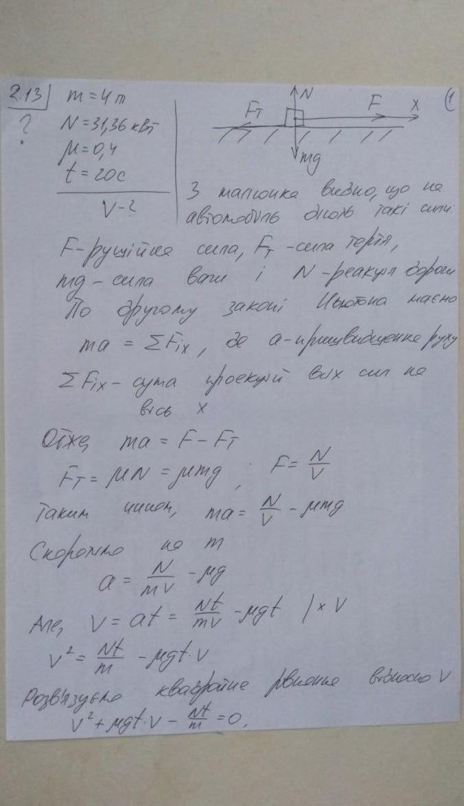 2.13. Автомобіль масою m = 4 т з обома ведучими осями рухається з місця. Двигун працює зі сталою потужністю N = 31,36 кВт. Коефіцієнт тертя ковзання коліс об дорогу дорівнює р = 0,4. Якою буде швидкість автомобіля через час t = 20 с?