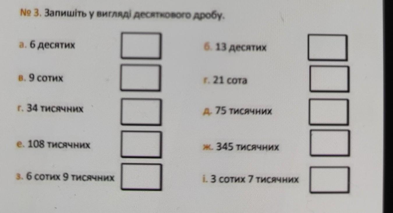 а. 6 десятих в. 9 сотих г. 34 тисячних е. 108 тисячних 3. 6 сотих 9 тисячних 00000 6. 13 десятих г. 21 сота д. 75 тисячних ж. 345 тисячних 1. З сотих 7 ТИСЯЧНИХ
