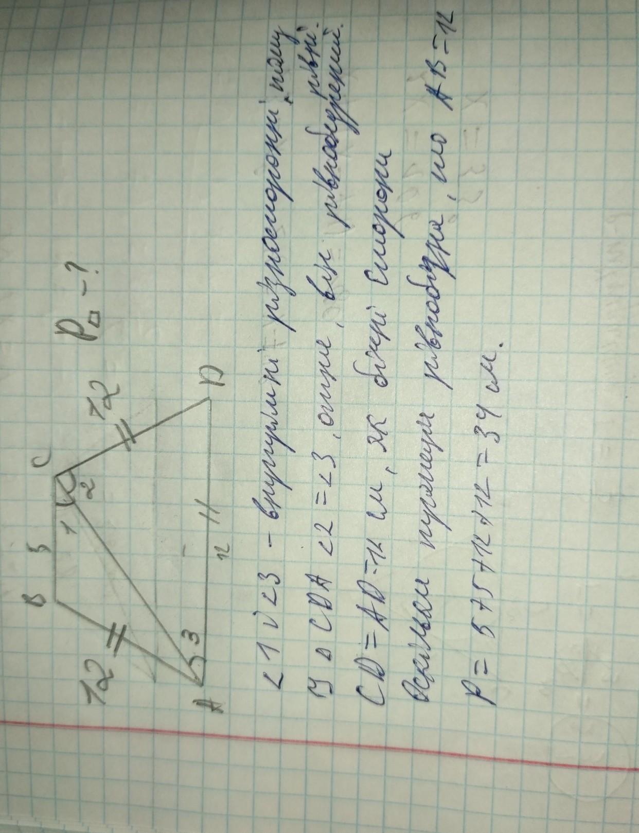 !!!!!!!!!!СРОЧНО!!!!!!!!!! Основи рівнобічної трапеції дорівнюють 5 см і 12 см,а діагональ є бісектрисою тупого кута. Знайти периметр трапеції