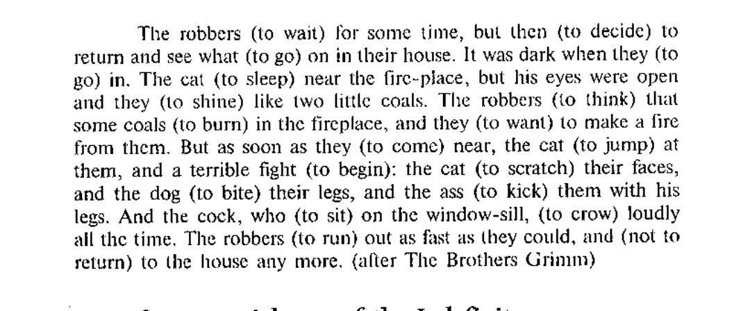 continued(мб неправильно), came, were going, saw, went, were coming, was burning(?) was getting, understood, reached, jumped, climbed, flew, looked, asked, was going, answered, was seeing (saw??), were sitting, enjoying, decided, began, was crowing, was barking, was mewing, was braying, didn’t understand, was going, was coming(?), jumped, ran. were waiting, decided, was going, went, was sleeping, were shining, thought, were burning, wanted, came, jumped, began, was scratching, was biting, was kicking, was sitting, crowing, ran, didn’t return.