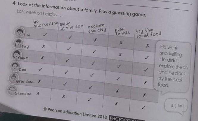 Відповідь: She did not go snorkelling, but she played tennis and tried the local food(mum). She did not go snorkelling and did not play tennis, but she tried the local food(Fay). He did not try the local food, but he explored the city and played tennis(dad). She did not go snorkelling, did not play tennis, did not try the local food but she explored the city(grandma). He did not go snorkelling, did not play tennis, did not swim in the sea but he tried the local food and explored the city(grandpa).