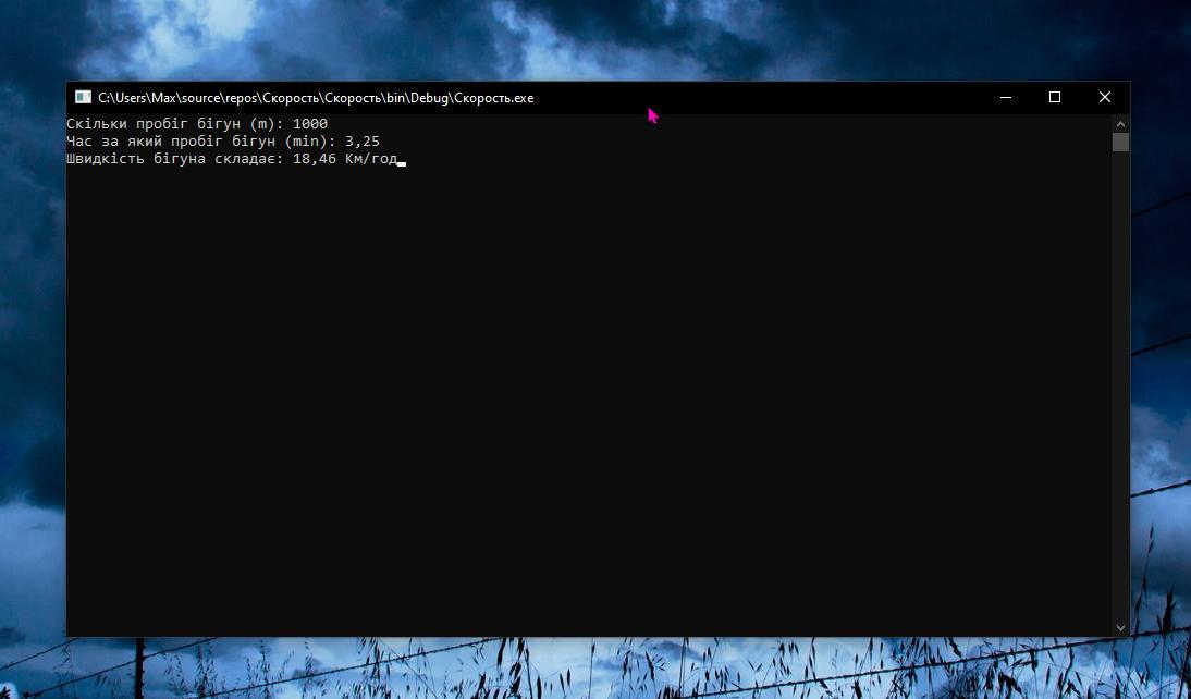Console.Write("Скiльки пробiг бiгун (m): ");