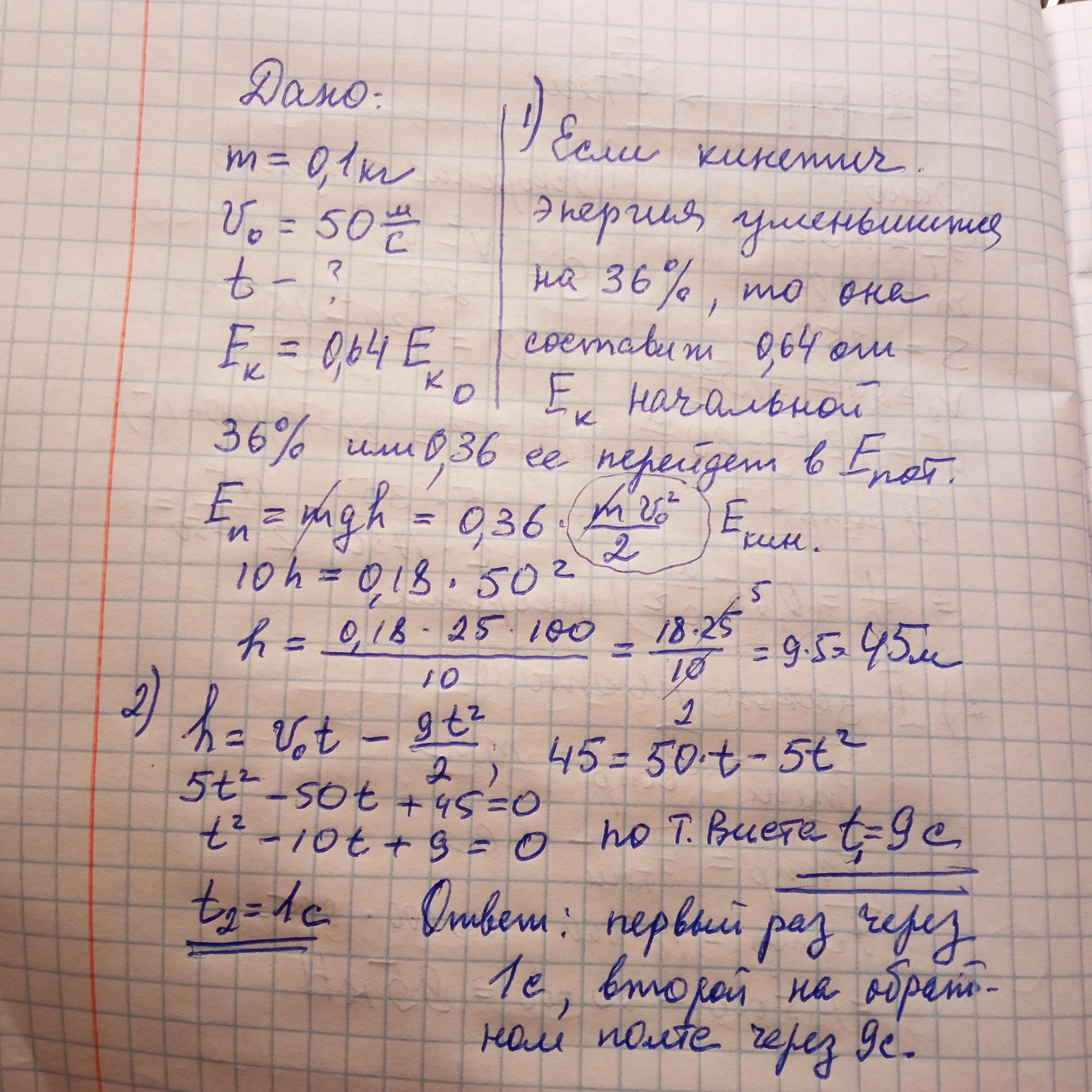 Кульку масою 100 г кинули вертикально вгору зі швидкістю 50 м/с. Через який проміжок часу кулька втратить 36 % своєї кінетичної енергії?