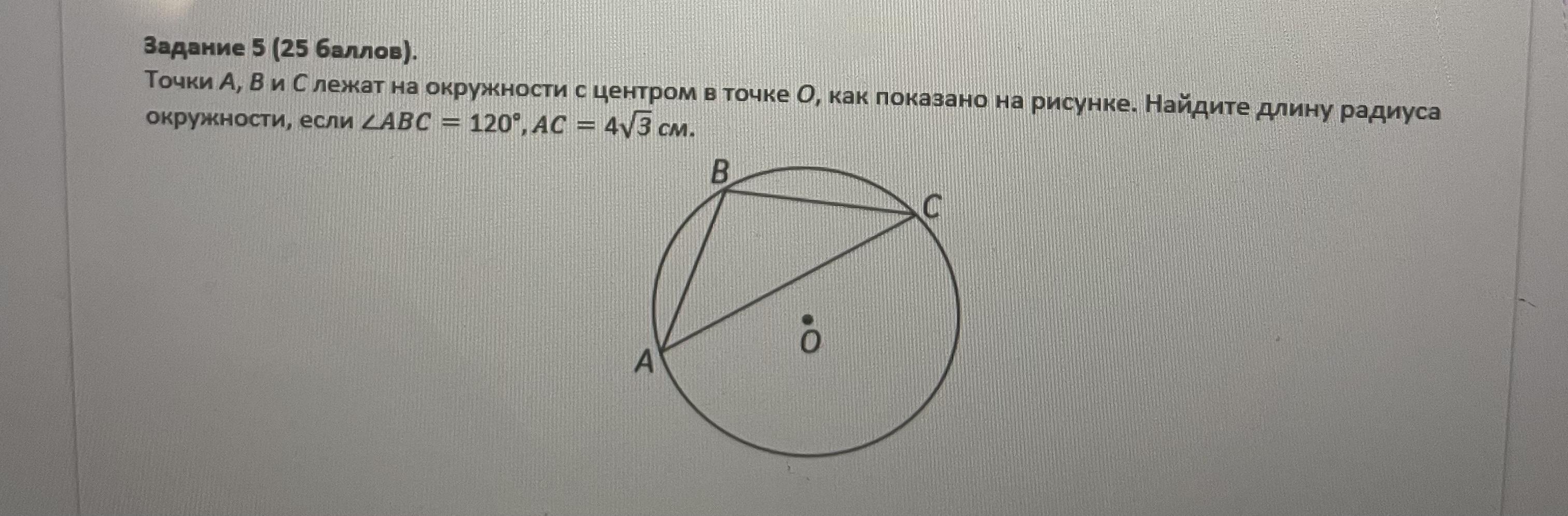 Точки А,В и С лежат на окружности с центром в точке О, как показано на рисунке. Найдите длину радиуса окружности, если уголАВС=120градусов, АС=4