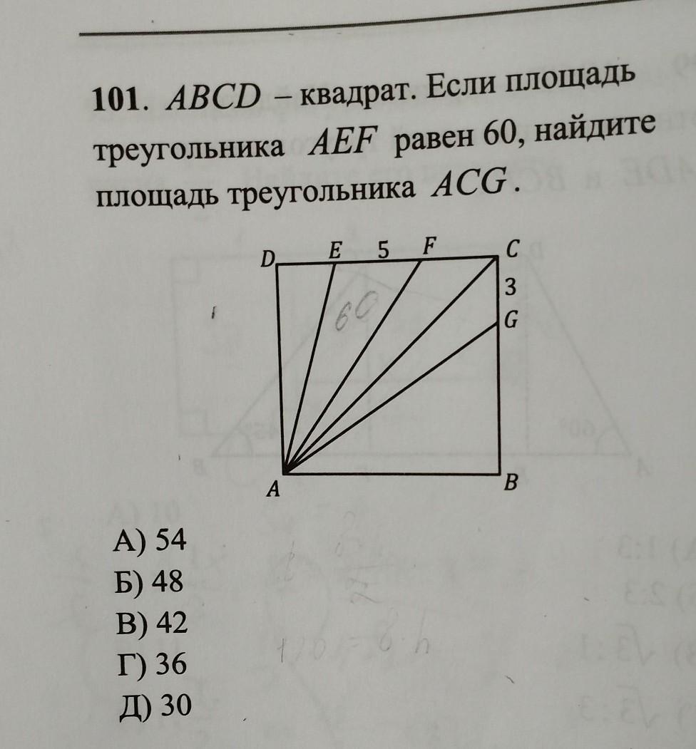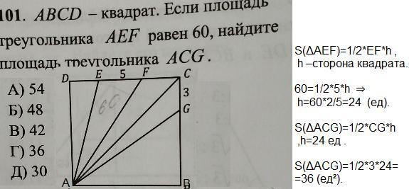 АВСD-квадрат. Если площадь треугольника АЕF равна 60 , найдите площадь ΔАСG.