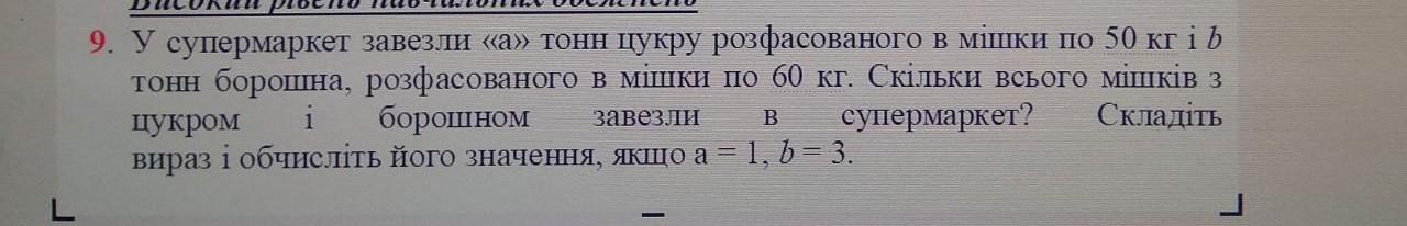 9. У супермаркет завезли «а» тонн цукру розфасованого в мішки по 50 кг і тонн борошна, розфасованого в мішки по 60 кг. Скільки всього мішків з цукром Складіть i борошном завезли B супермаркет? вираз і обчисліть його значення, якщо а = 1, b = 3.