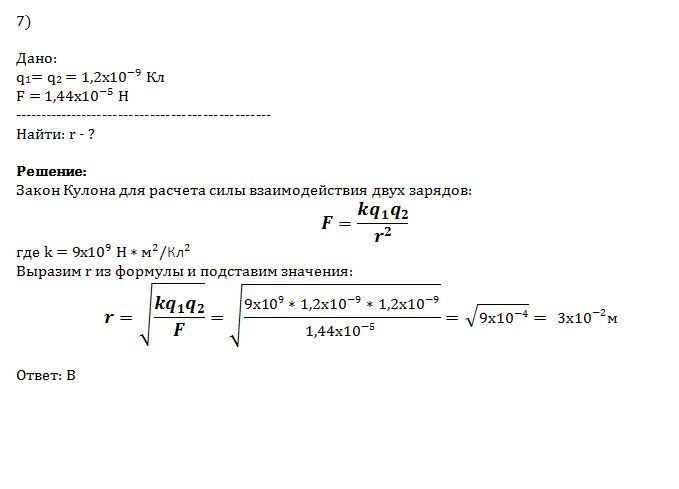 7. Два заряда, по 1,2*10⁻⁹ Кл каждый, взаимодействуют в вакууме с силой 1,44*10⁻⁵Н. Расстояние между зарядами равно: