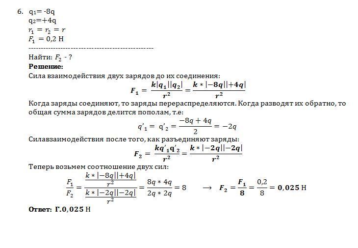 6.Два точечных заряда -8q и +4q взаимодействуют в вакууме с силой 0.2Н. Заряды соединили и развели на прежнее расстояние. Сила взаимодействия стала равна:
