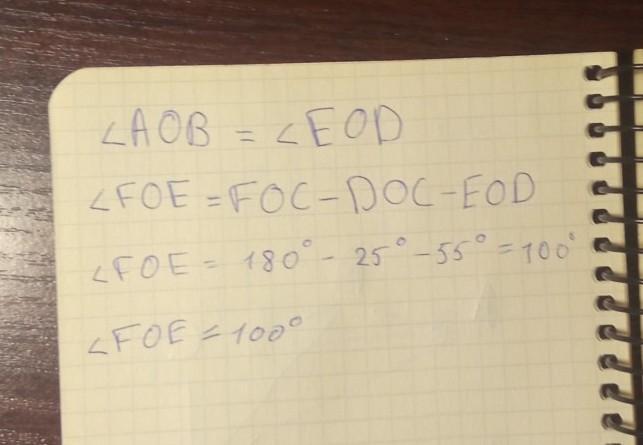 Угол АОВ = угол DOE (как вертикальные углы) = 55°