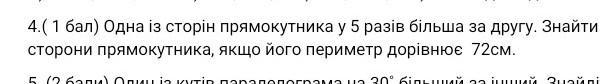 Одна із сторін прямокутника у 5 разів більша за другу. Знайти сторони прямокутника, якщо його периметр дорiвнює 72см.