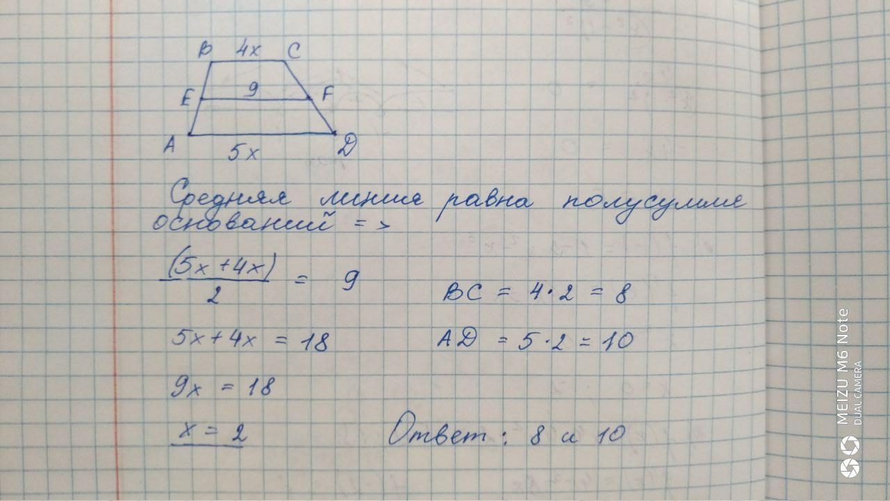 СРОЧНО ПЖПЖПЖЖП Основи трапеції відносяться як 4: 5, а середня лінія дорівнює 9. Знайдіть основи