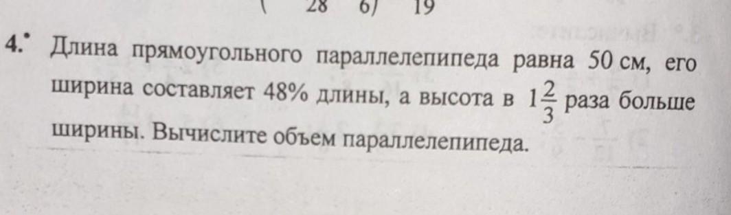 4. Длина прямоугольного параллелепипеда равна 50 см, его ширина составляет 48% длины, а высота в 12 ширины. Вычислите объем параллелепипеда. раза больше