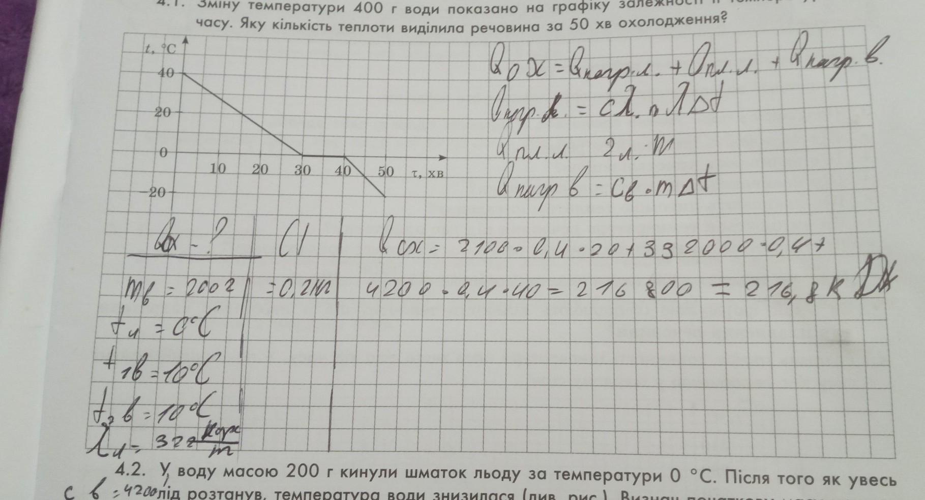 Змiну температури 400 г води показано на графіку залежності ї температури від часу. Яку кількість теплоти виділила речовина за 50 хв охолодження?