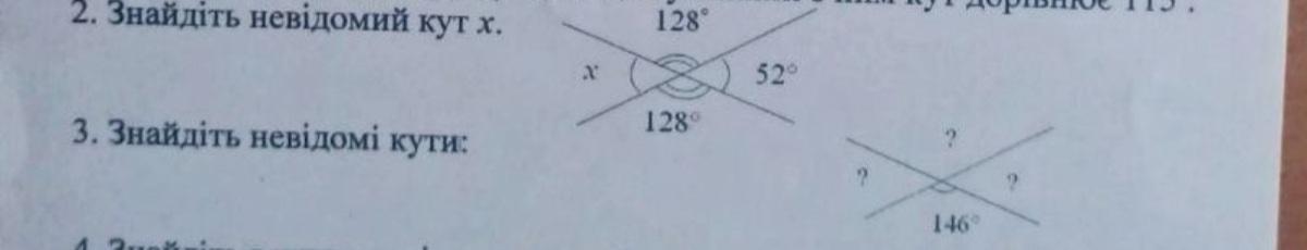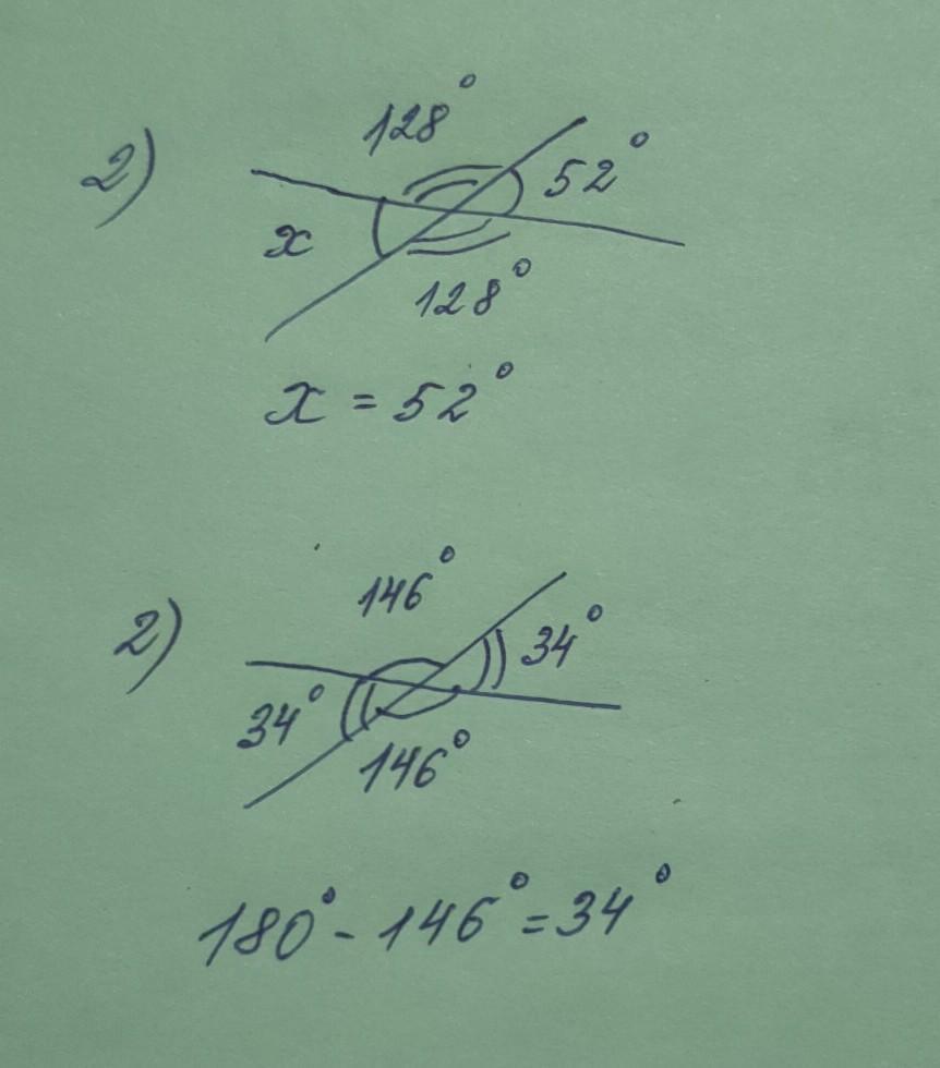 2)вертикальные углы равны, поэтому на первом рисунке угол равен 52°