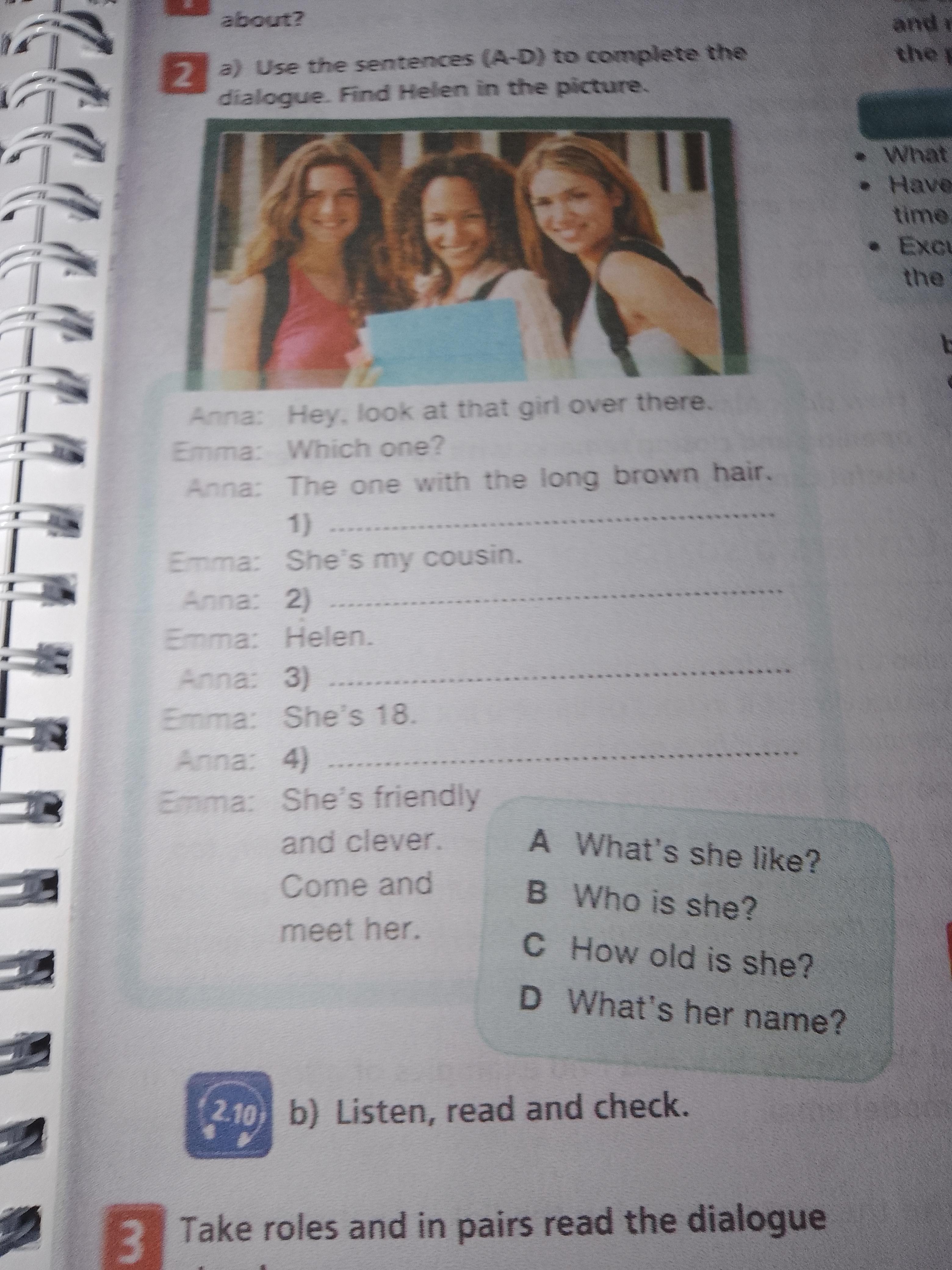 a) Use the sentences (A-D) to complete the dialogue. Find Helen in the picture. b) Listen, read and check.