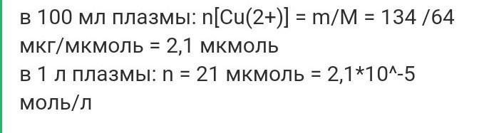 Содержание ионов Сu2+ составляет в плазме крови 85-134 мкг. Вычислите