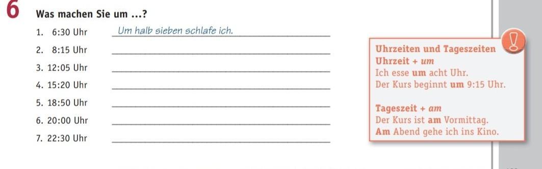 Ответ:2 ich früschtüke um viertel nach acht 3 ich gehe nach Hause um fünf minuten nach zwölf 4 ich lese ein Buch um zwanzig minuten nach fünfzehn 5 ich spiele mit meinen Freunden um zehn minuten vor neunzehn 6 ich esse ein Apfel um zwanzig 7 ich schlafe um halb eins