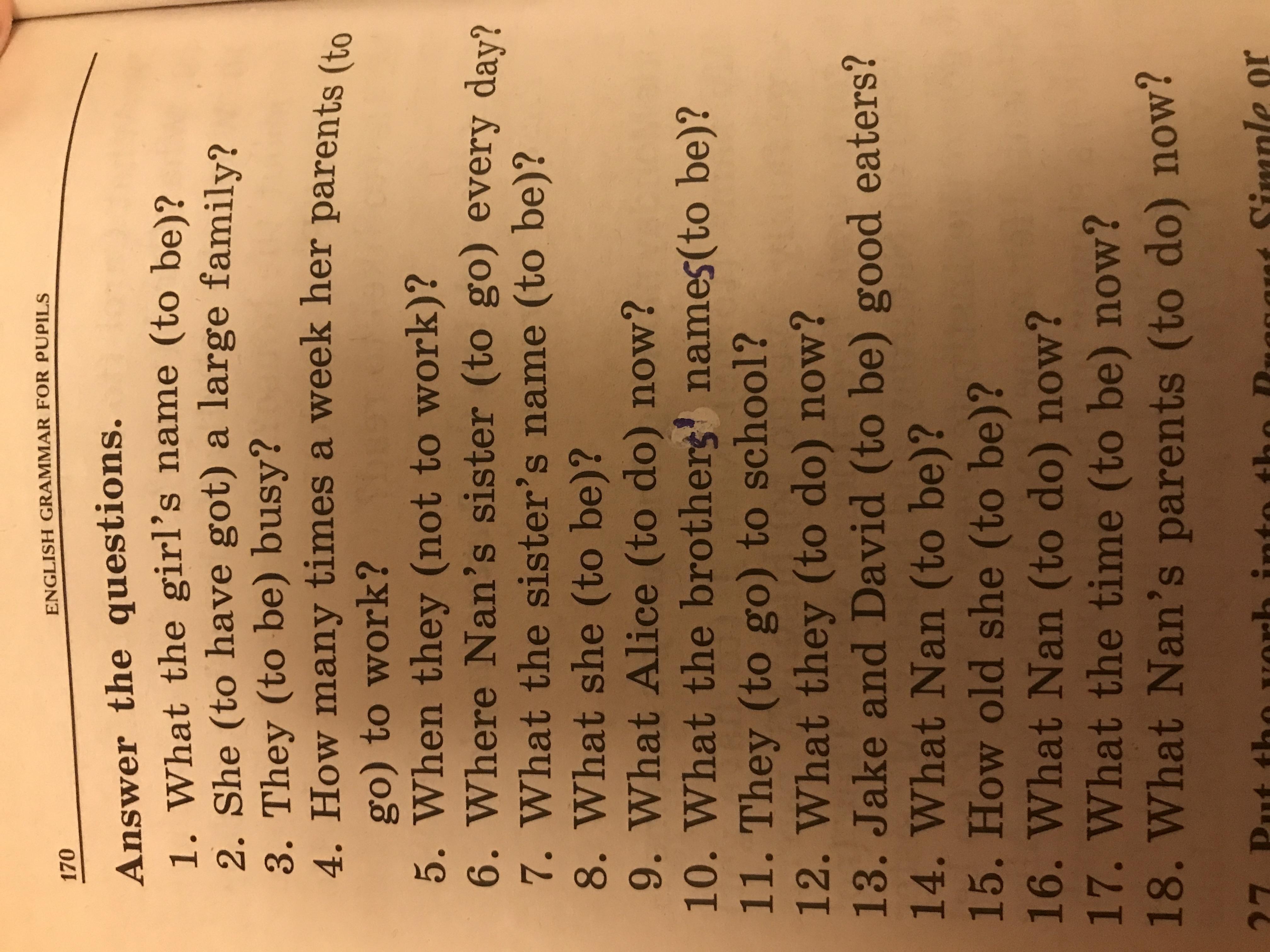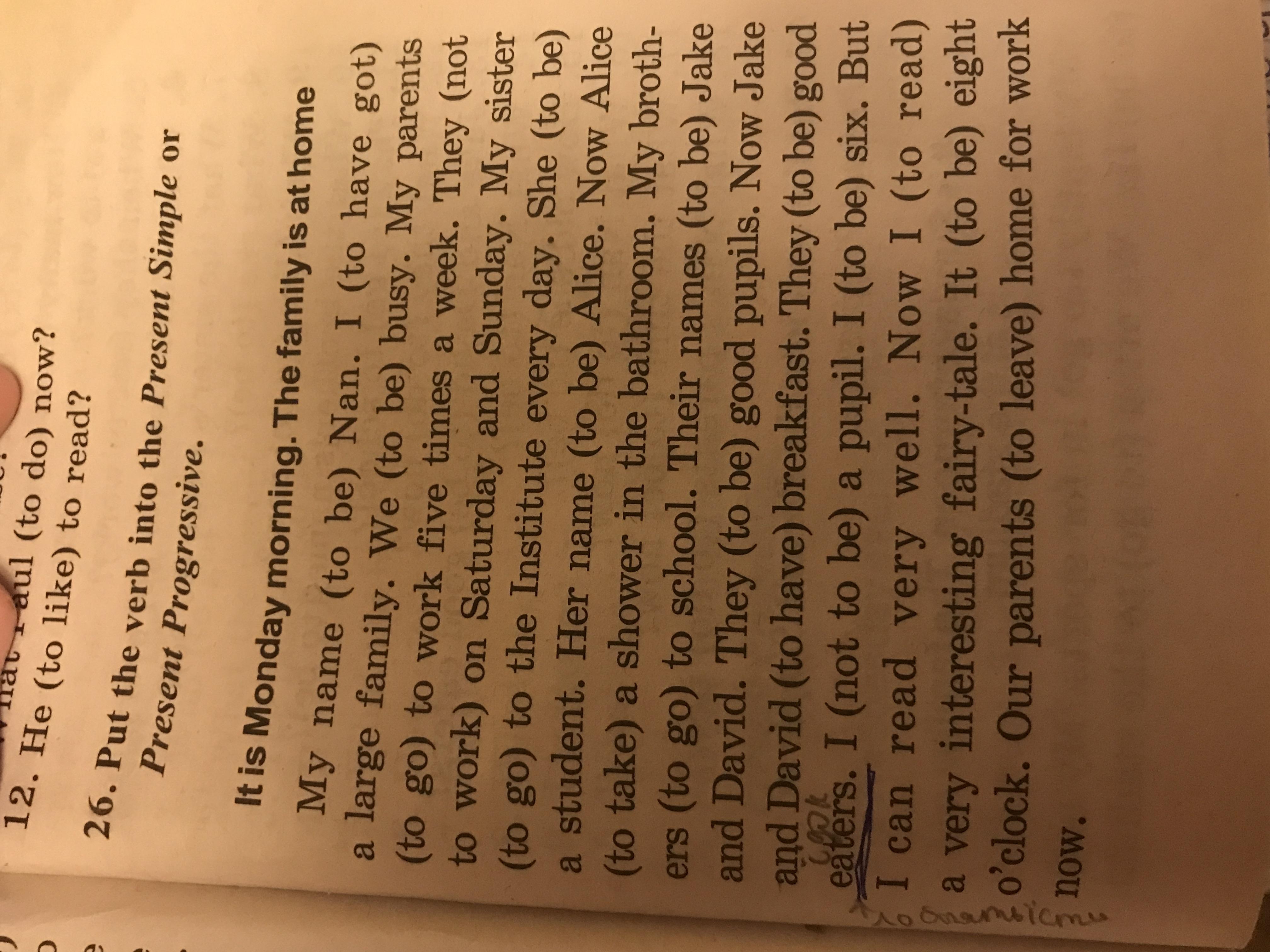 My name is Nan. I have got a large family. We are busy. My parents go to work five times a week. They don't work on Saturday and Sunday. My sister goes to the Institute every day. She is a student. Her name is Alice. Now Alice is taking a shower in the bathroom. My brothers go to school. Their names are Jake and David. They are good pupils. Now Jake and David are having breakfast. They are good eaters. I'm not a pupil. I'm six. But I can read very well. Now I'm reading a very interesting fairy-tale. It's eight o'clock. Our parents are leaving home for work now.