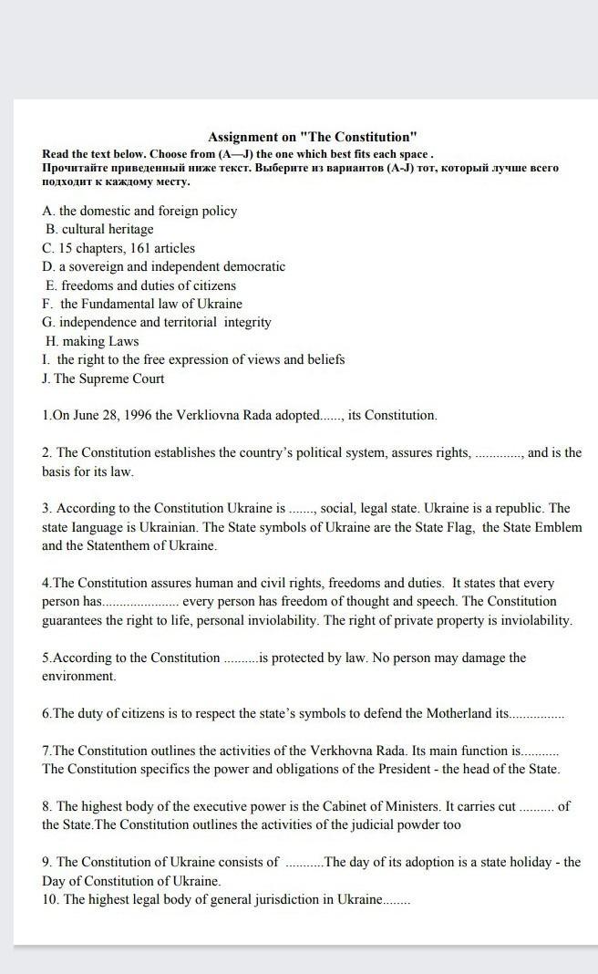 Assignment on "The Constitution" Read the text below. Choose from (A-J) the one which best fits each space. Прочитайте приведенный ниже текст. Выберите из вариантов (А-J) тот, который лучше всего подходит к каждому месту. A. the domestic and foreign policy B. cultural heritage C. 15 chapters, 161 articles D. a sovereign and independent democratic E. freedoms and duties of citizens F. the Fundamental law of Ukraine G. independence and territorial integrity H. making Laws I. the right to the free expression of views and beliefs J. The Supreme Court 1.On June 28, 1996 the Verkliovna Rada adopted........, its Constitution. 2. The Constitution establishes the country's political system, assures rights, basis for its law. and is the 3. According to the Constitution Ukraine is........, social, legal state. Ukraine is a republic. The state language is Ukrainian. The State symbols of Ukraine are the State Flag, the State Emblem and the Statenthem of Ukraine. 4. The Constitution assures human and civil rights, freedoms and duties. It states that every person has.. every person has freedom of thought and speech. The Constitution guarantees the right to life, personal inviolability. The right of private property is inviolability. 5.According to the Constitution.......... is protected by law. No person may damage the environment. 6. The duty of citizens is to respect the state's symbols to defend the Motherland its.............. 7. The Constitution outlines the activities of the Verkhovna Rada. Its main function is............ The Constitution specifics the power and obligations of the President - the head of the State. 8. The highest body of the executive power is the Cabinet of Ministers. It carries cut............. of the State. The Constitution outlines the activities of the judicial powder too 9. The Constitution of Ukraine consists of....... ..The day of its adoption is a state holiday - the Day of Constitution of Ukraine. 10. The highest legal body of general jurisdiction in Ukraine...........