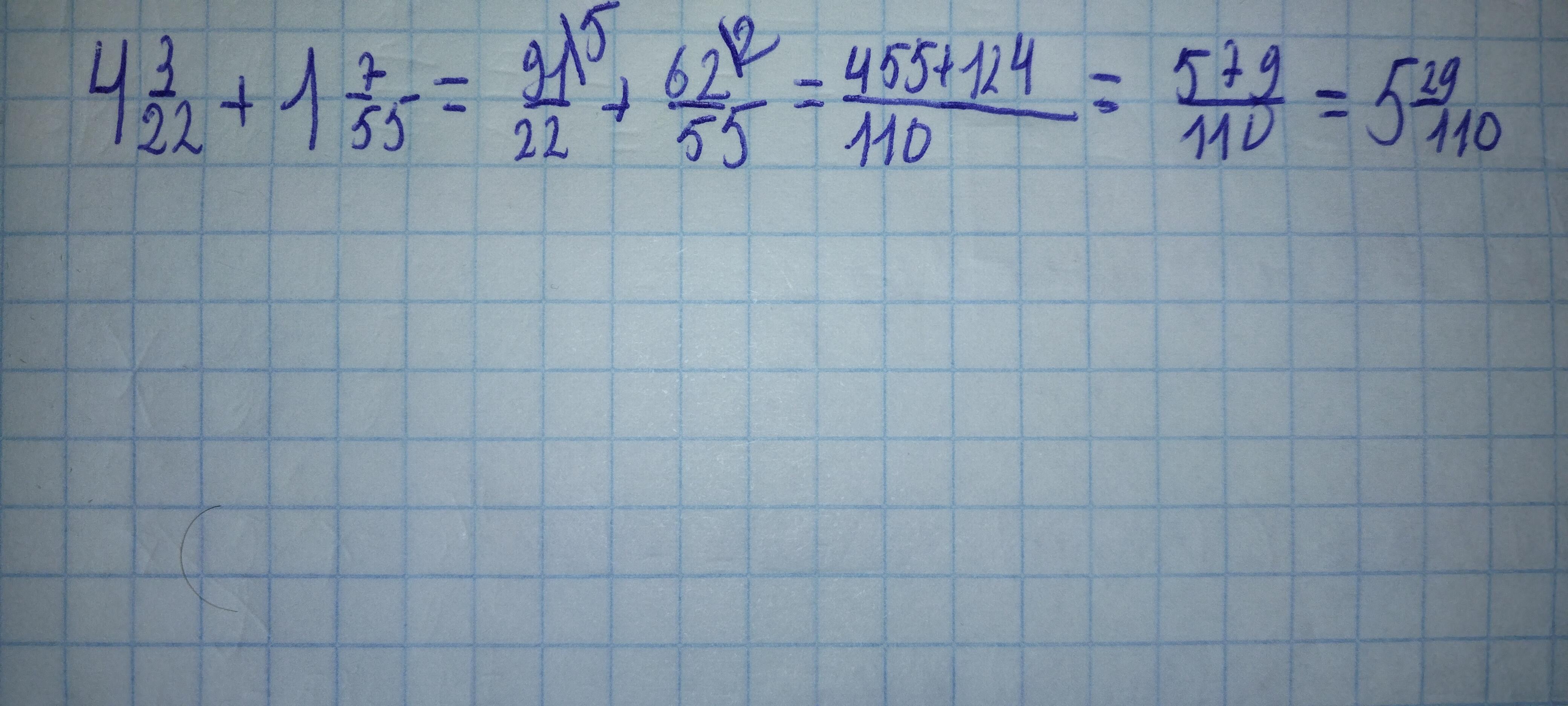 4 3/22 + 1 7/55 = ( 4 + 1 ) + ( 3/22 + 7/55) = 5 + 29/110 = 5 29/110