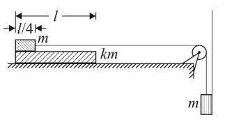 Брусок массой m лежит на доске массой km, как показано на рисунке. Доска располагается на гладком горизонтальном столе, а брусок соединен с грузом массой m с помощью невесомого блока и невесомой нерастяжимой нити, отрезок которой от блока до бруска горизонтален. Коэффициент трения между поверхностями доски и бруска μ = 0,3. Груз удерживают так, что нить слегка натянута, и в некоторый момент времени отпускают из состояния покоя. Пренебрегая трением между поверхностью доски и столом, а также трением в оси блока, определите расстояние Δx, на которое сместится доска за время, в течение которого брусок будет находиться на доске всей своей поверхностью, если k = 2, длина доски l = 85.0 см, а длина бруска равна l/4.