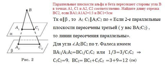 Параллельные плоскости альфа и бета пересекают стороны угла B в точках A1, C1 и A2, C2 соответственно. Найдите длину отрезка BC2, если BA1:A1A2=1:3 и BC1=3см