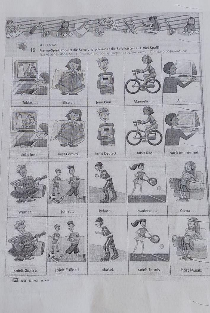 ДОПОМОЖІТЬ!!!ТЕРМІНОВО!!! SPIEL & SPASS 16 Memo-Spiel. Kopiert die Seite und schneidet die Spielkarten aus. Viel Spaß! Гра на запам'ятовування. Сколюйте сторiнку вирте градь картки. Приемно розважитися! Tobias. sieht fern. Werner MKE spielt Gitarre ADA 0.47 Elisa... liest Comics. John.... & spielt Fußball. Jean Paul ... lemt Deutsch Roland ... skatet. Manuela... C fährt Rad Marlena... spielt Tennis. Ali surft im Internet. Olena ... hört Musik.