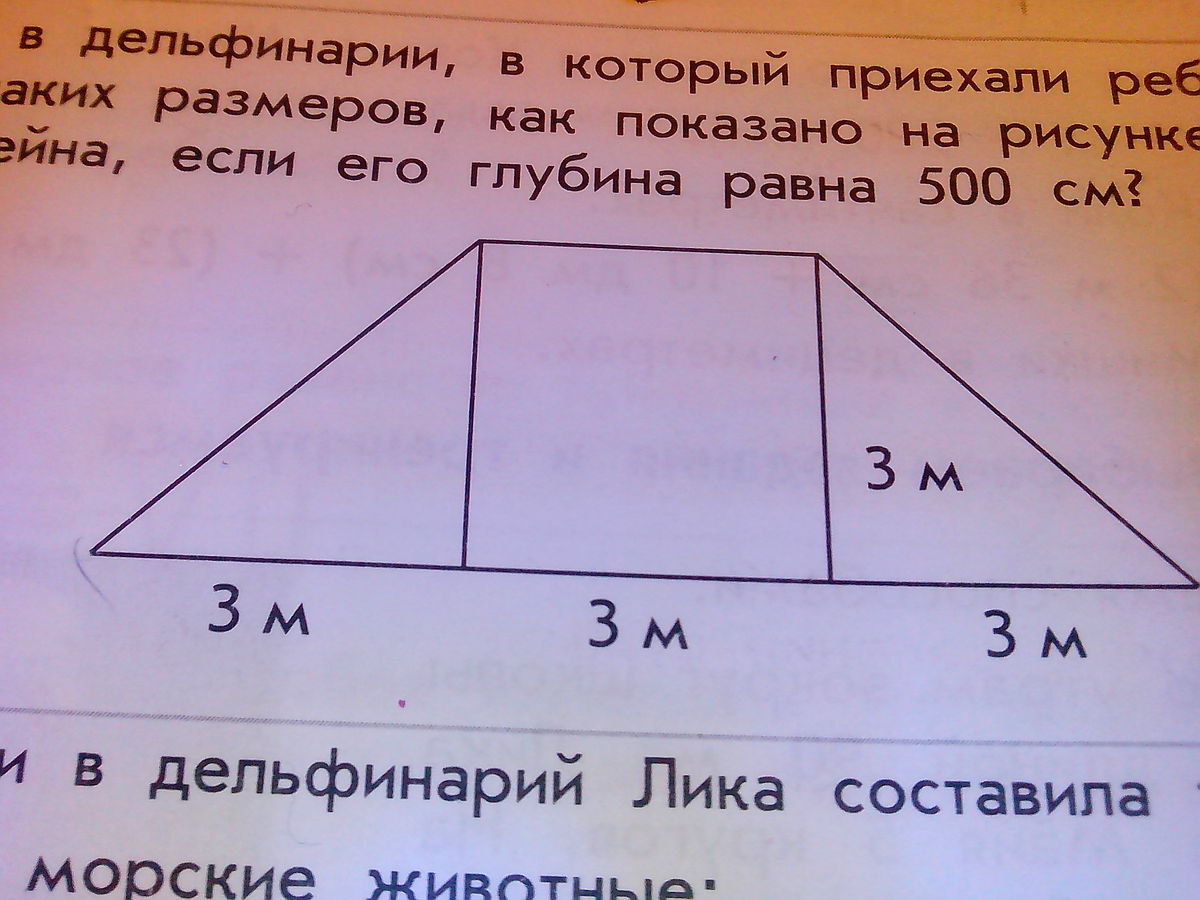 Помогите решить задачу !!! Бассейн в дельфинарии,в который приехали ребята,имеет пол такой формы и таких размеров,как показано на рисунке. Чему равен объем этого бассейна,если его глубина 500 см?