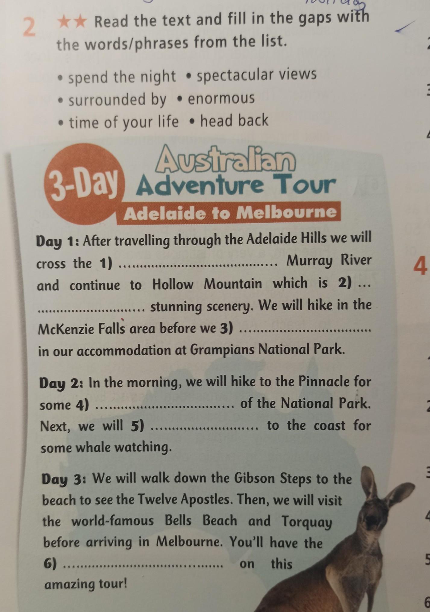 34 2 ★★ Read the text and fill in the gaps with words/phrases from the list. the spectacular views • spend the night • surrounded by • enormous time of your life • head back Australian 3-Day Adventure Tour Adelaide to Melbourne Day 1: After travelling through the Adelaide Hills we will cross the 1) ............ .... Murray River and continue to Hollow Mountain which is 2)... stunning scenery. We will hike in the McKenzie Falls area before we 3) in our accommodation at Grampians National Park. Day 2: In the morning, we will hike to the Pinnacle for some 4)... ....... of the National Park. .. to the coast for Next, we will 5)....... some whale watching. Day 3: We will walk down the Gibson Steps to the beach to see the Twelve Apostles. Then, we will visit the world-famous Bells Beach and Torquay before arriving in Melbourne. You'll have the 6) .... on this amazing tour! 4
