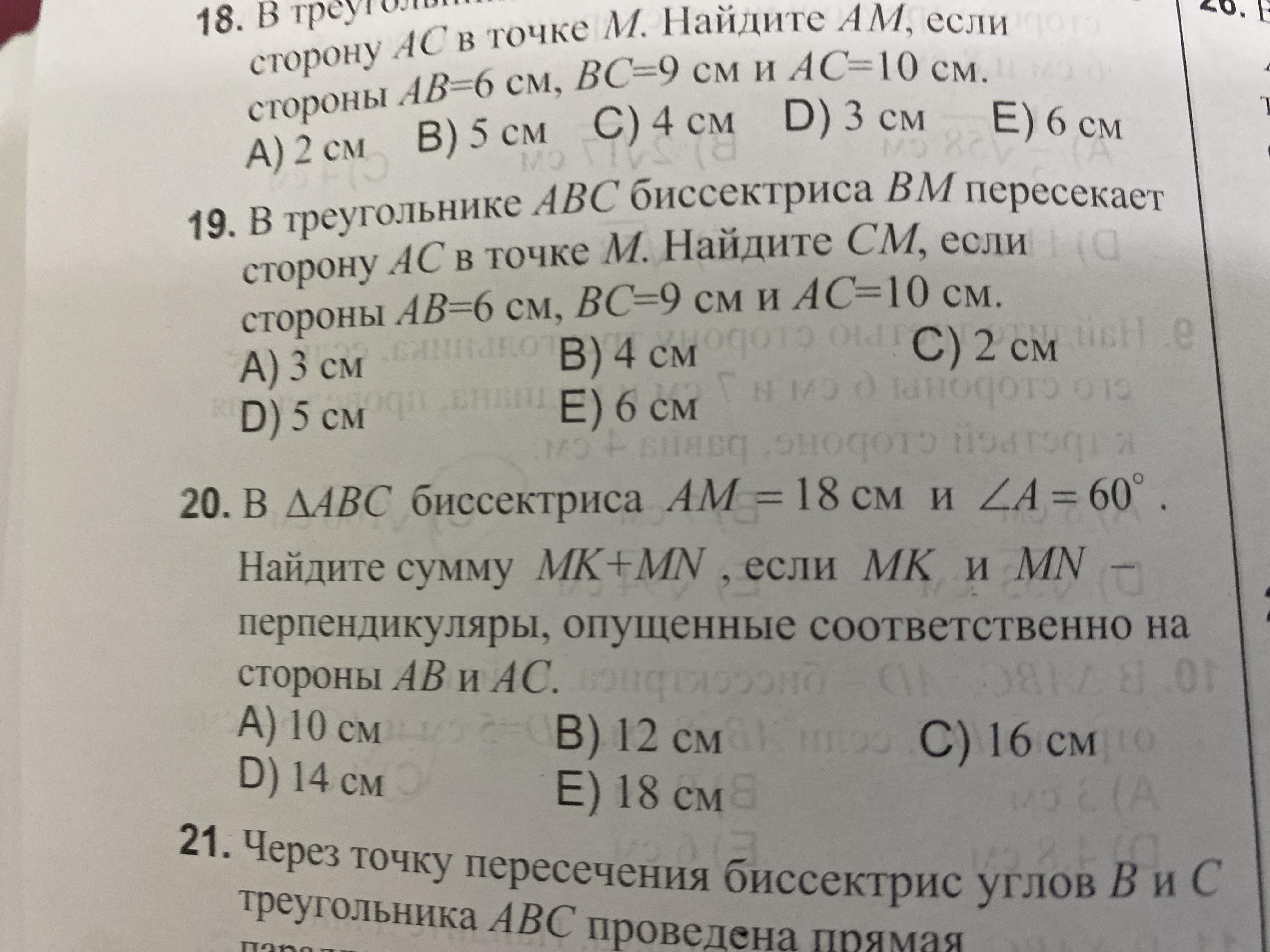 19. биссектрисса делит сторону пропорционально ВС /АВ=9/6=1,5 В такой пропорции поделена АС. СМ=АС/(3+2)*3=10/5*3=6 см