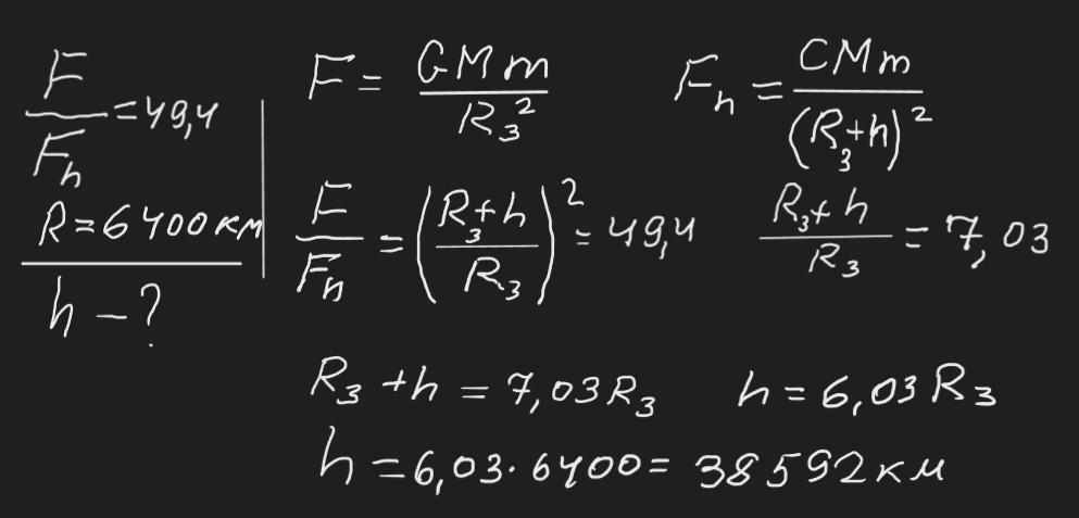 Обчисли висоту,на якій сила притягання,яка діє на тіло,буде в49,4 разів менша, ніж на поверхні Землі.Радіус Землі прийняти рівним 6400 км