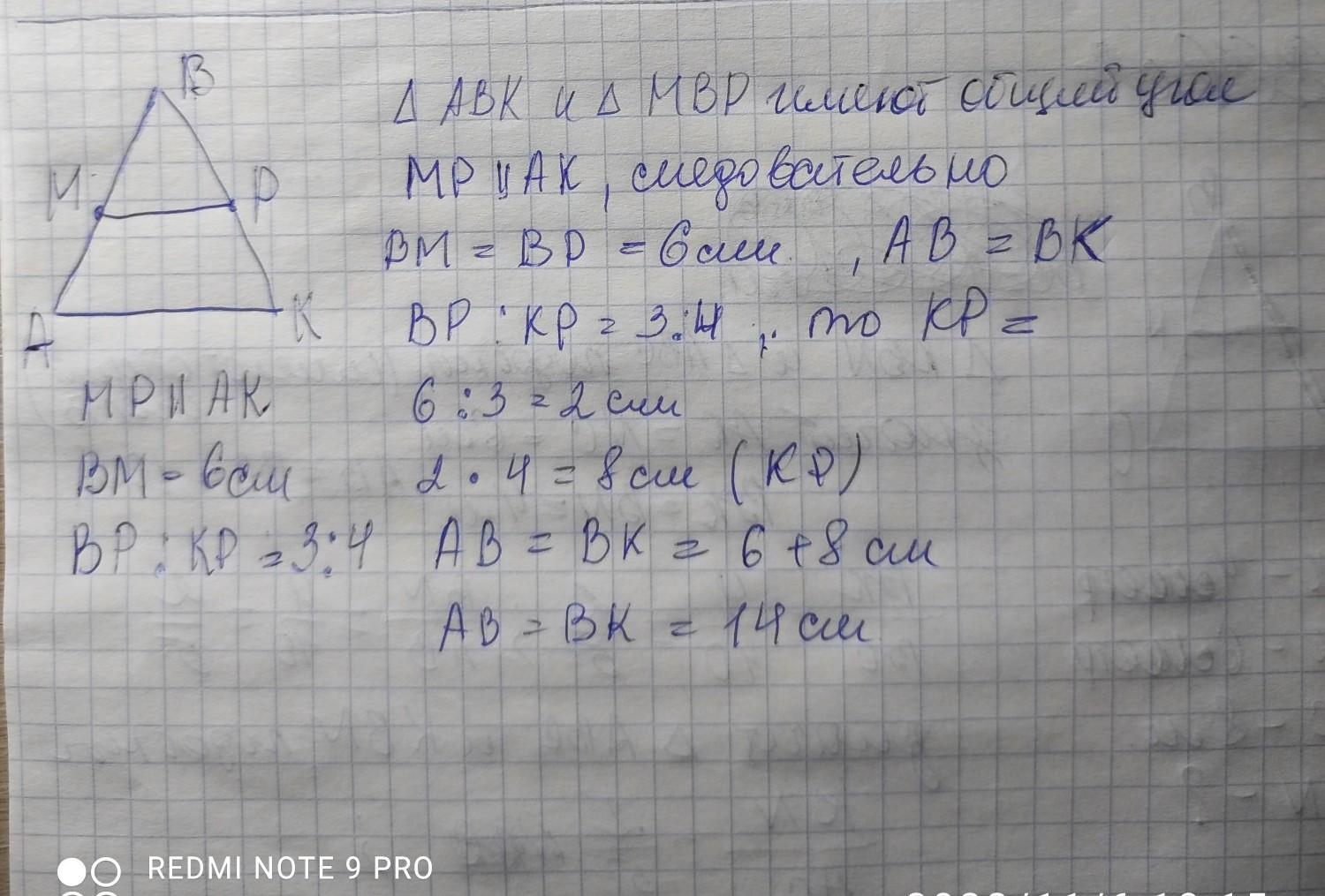 Срочно!!!!Даю 45б. Через точку М сторони АВ ∆ ABK проведено площину, яка паралельна прямій АК і перетинає сторону ВК у точці Р. Знайдіть довжину АВ, якщо ВМ=6 см, ВР:КР=3:4.